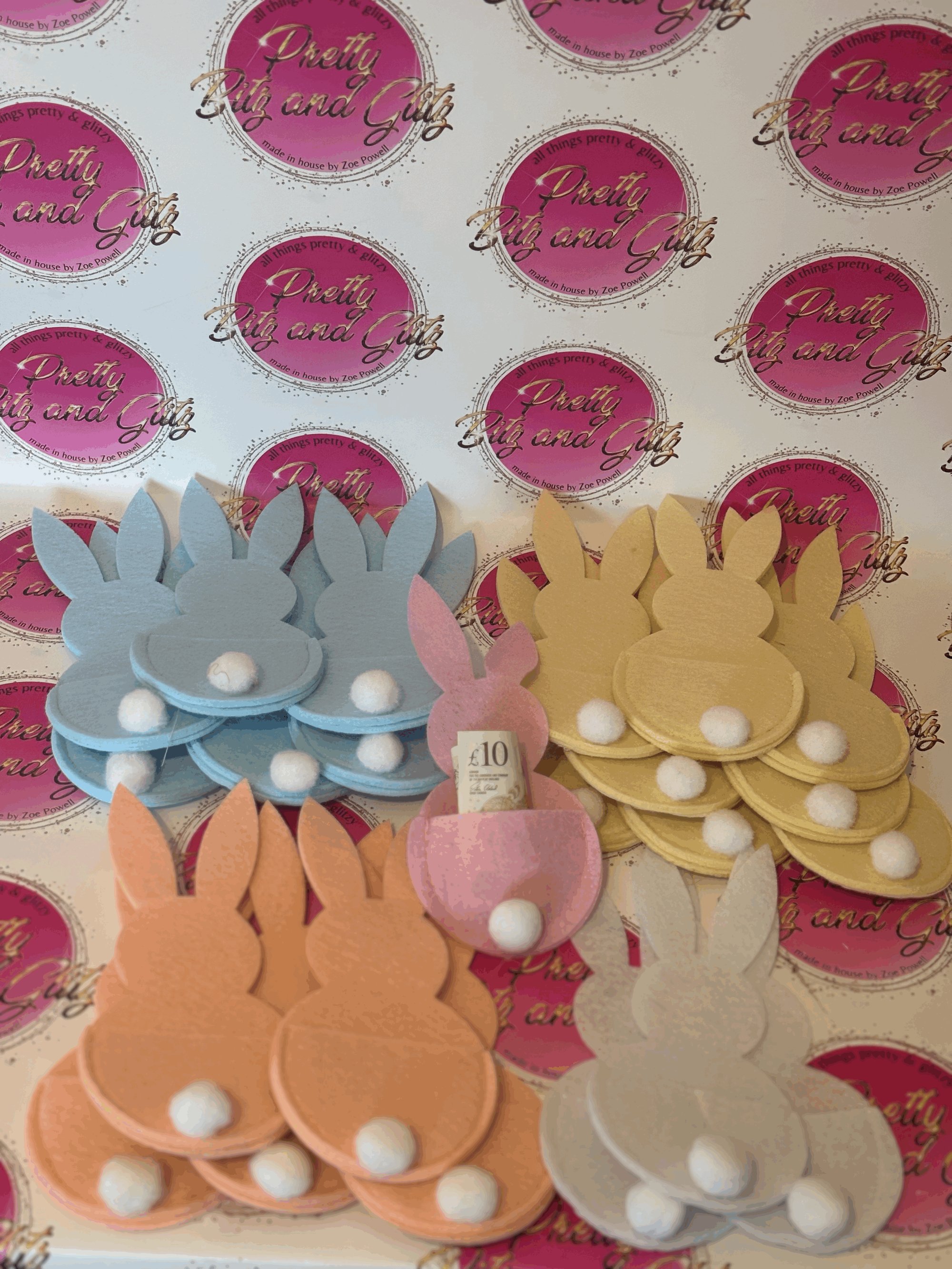 Cute little bunny holders perfect to fit money, cutlery set or even small kinder chocolate bars.